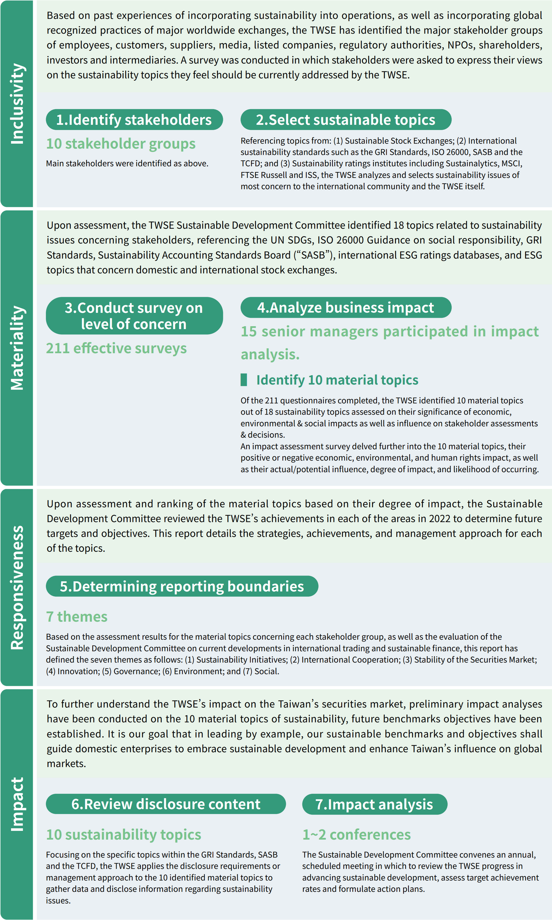 As the main platform in Taiwan's securities market matching fundraising corporations and investors, the TWSE assists domestic companies in listing, raising capital and expanding operations, while protecting the rights and interests of shareholders in addition to building dialogue between various stakeholders. To strengthen stakeholder engagement, the TWSE has taken as reference the four principles of the AA1000 AccountAbility Principles (2018), which are inclusivity, materiality, responsiveness and impact. Furthermore, the reporting standards and management approach of material topics in the GRI Standards serve as a solid framework through which to identify and analyze material topics that concern stakeholders.