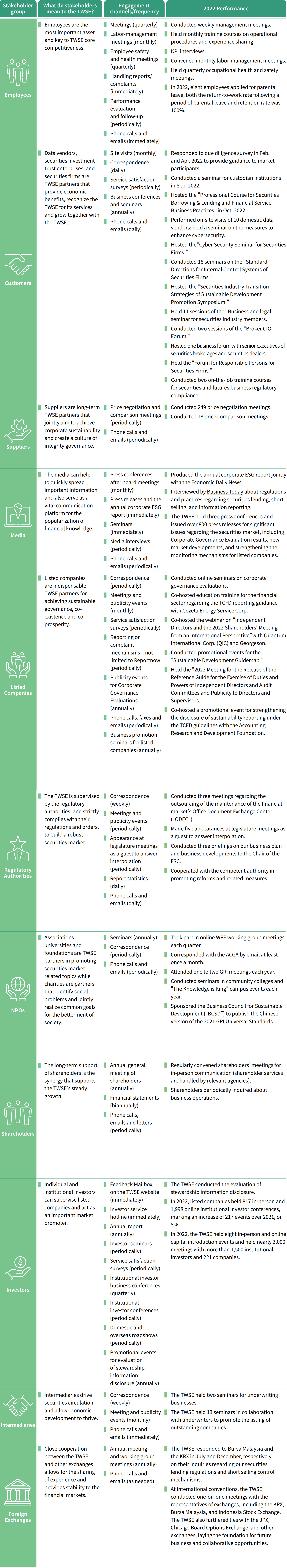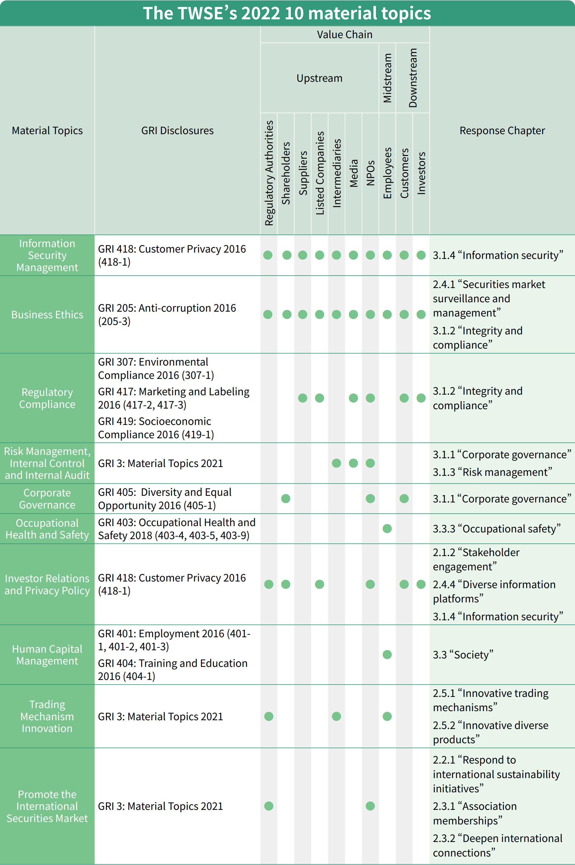 For more information regarding the TWSE's actions and achievements in the 10 material topics, please refer to the section titled "Management Approach to Material Topics."
