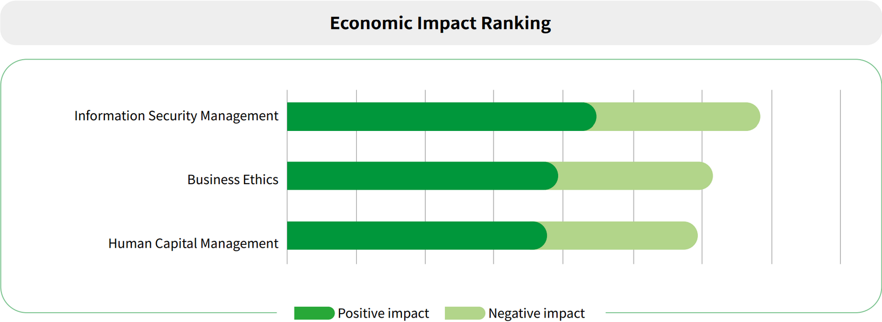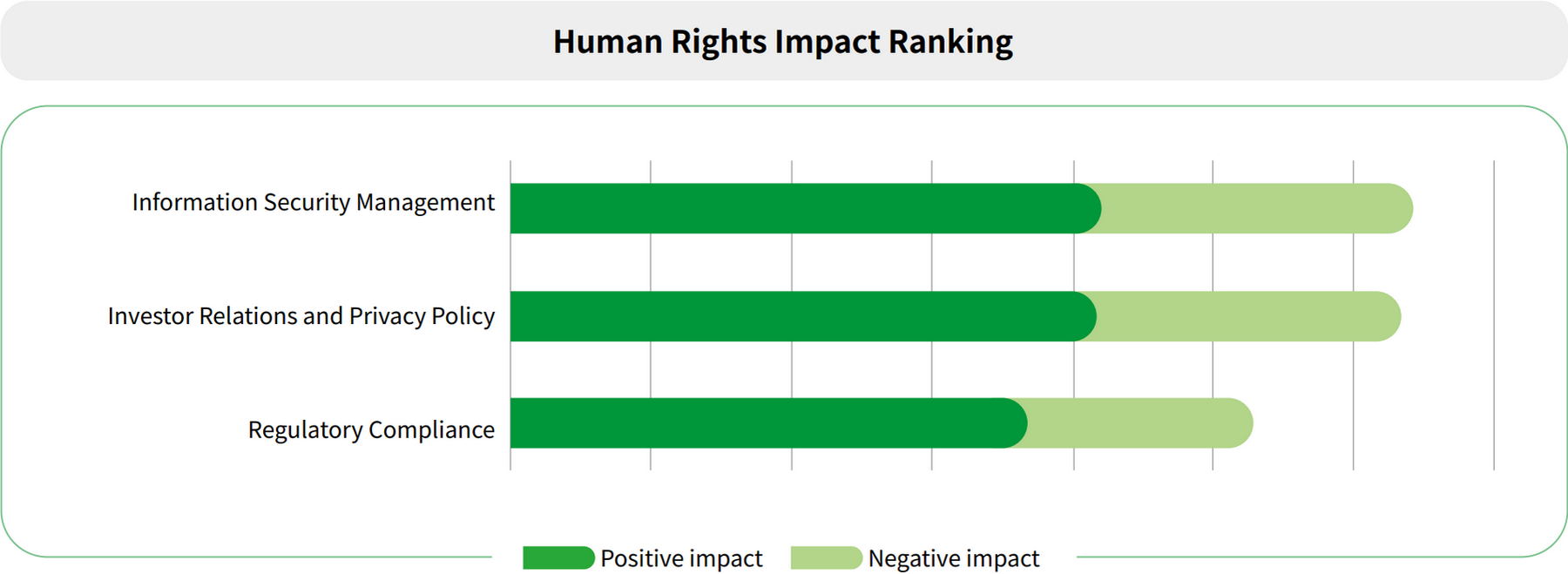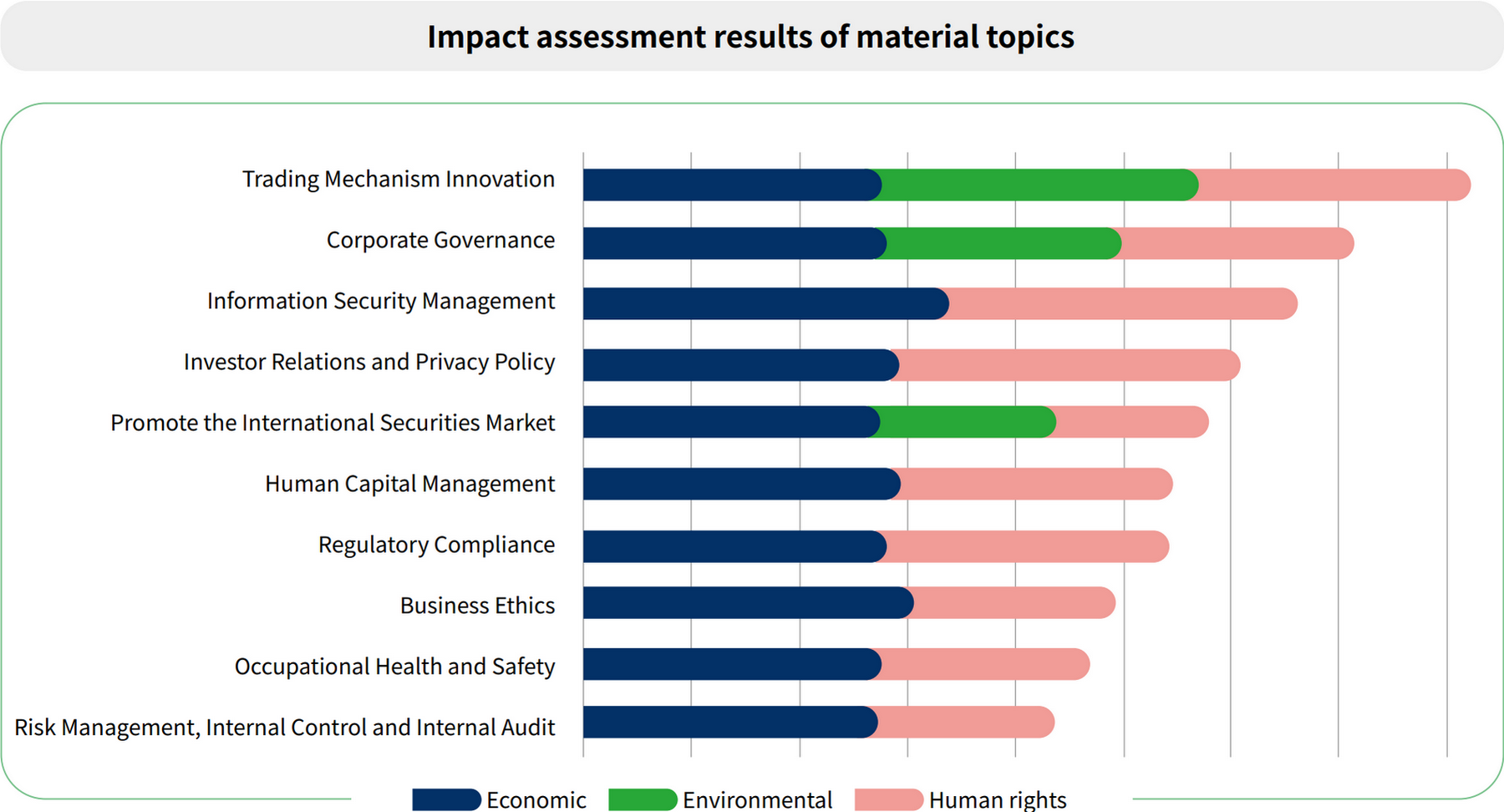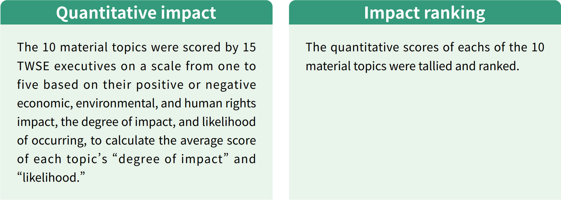 TWSE management assessed the 10 material topics, their positive or negative economic, environmental, and human rights impact, as well as their actual/potential influence, degree of impact, and likelihood of occurring. These factors were compiled in preliminary findings and ranked for 2022.