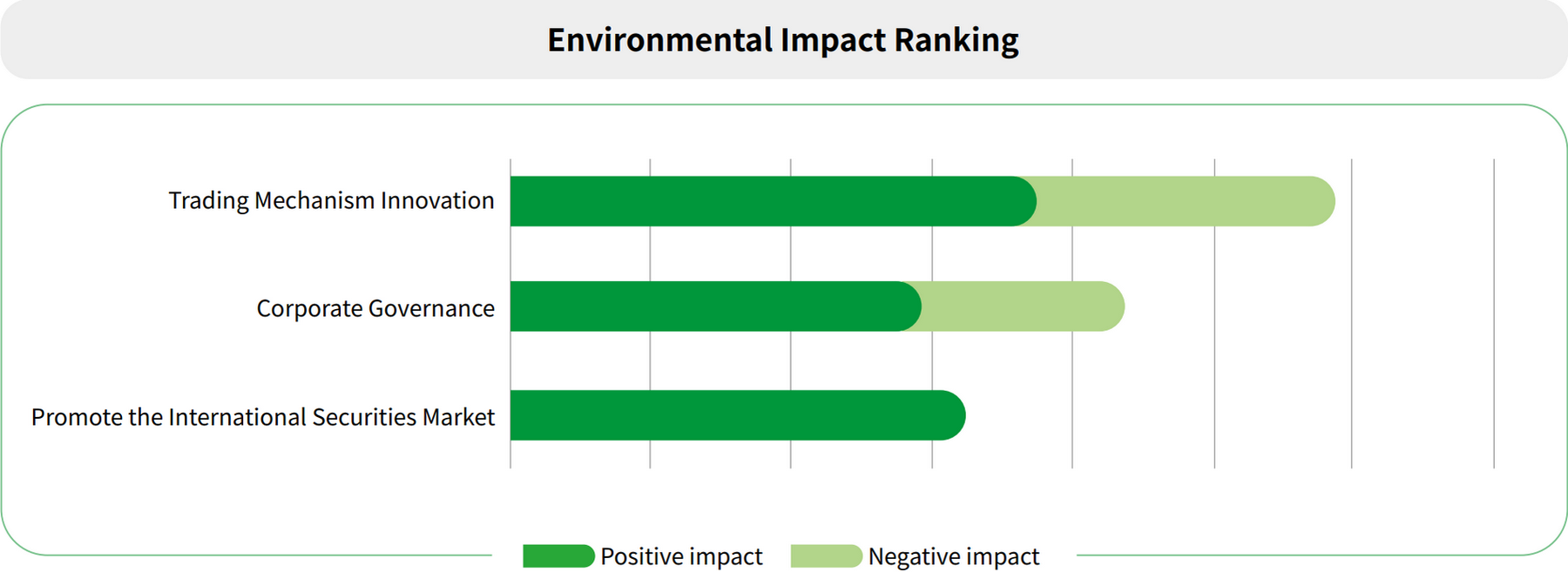 The overall quantitative impact analysis of the 10 topics, as assessed by the TWSE management by degree of impact and likelihood, are presented below. Of the 10 material topics, management believes that "Trading Mechanism Innovation," "Corporate Governance," and "Information Security Management" in terms of their positive or negative economic, environmental, and human rights impact, are the three areas most likely to affect the TWSE significantly.