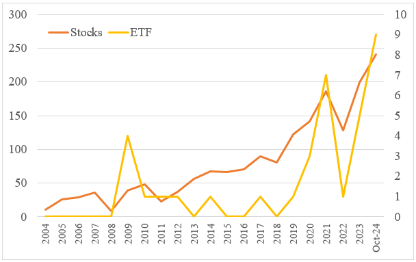 According to statistics, there were only 11 stocks with stock prices exceeding NT$100 in the centralized market in 2004. In the year before the introduction of the intraday odd-lot trading (i.e., the end of 2019), there were 122 stocks with stock prices exceeding NT$100, but as of the end of October 2024, the number of stocks with stock prices exceeding NT$100 has reached 250, and there are even 12 stocks with stock prices exceeding NT$1,000. With the continuous increase in the number of high-price stocks, the investment threshold has been raised, making it difficult for some investors with limited capital to enter the market. This means that under the regular trading session, many investors with limited capital find it difficult to invest in high-price stocks.