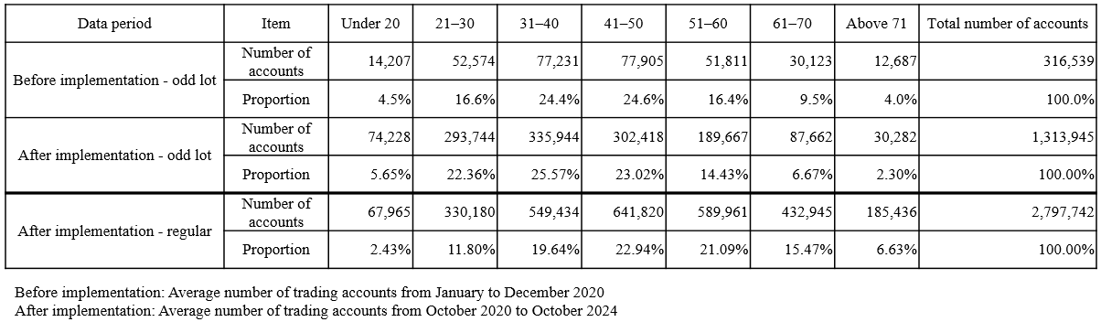 After the implementation of the intraday odd-lot trading on October 26, 2020, the daily average trading value was about NT$2.8 billion as of the end of October 2024, accounting for about 0.86% of the total trading value in the TWSE market. Adding the daily average trading value of NT$164 million for after-hours odd-lot trading, the daily average trading value of odd-lot trading was about NT$2.968 billion, accounting for about 0.91% of the total trading value in the TWSE market. Compared with that in the pre-implementation period (January to September 2020), the daily average trading value of after-hours odd-lot trading was about NT$223 million, accounting for about 0.12% of the total trading value in the TWSE market, which increased by nearly 12.57 times and 7.58 times respectively. This shows that both the trading value and proportion of odd-lot trading have significantly increased.