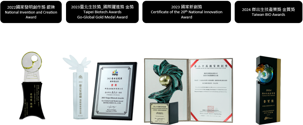 Bonraybio’s innovative products have been recognized by various domestic awards. In May 2023, the company’s products stood out among 459 qualified entries and won the silver medal of the ‘National Invention and Creation Award”. In September of the same year, the company won the gold medal of the “Taipei Biotech Awards – Go-Global Medal Award” and was awarded the “20th National Innovation Award - Enterprise Innovation Award” in December. In July 2024, the company won the “Taiwan BIO Awards - Gold Award”. The company’s repeated outstanding achievements in various authoritative competitions in the industry demonstrate its highly recognized research and development capabilities.
