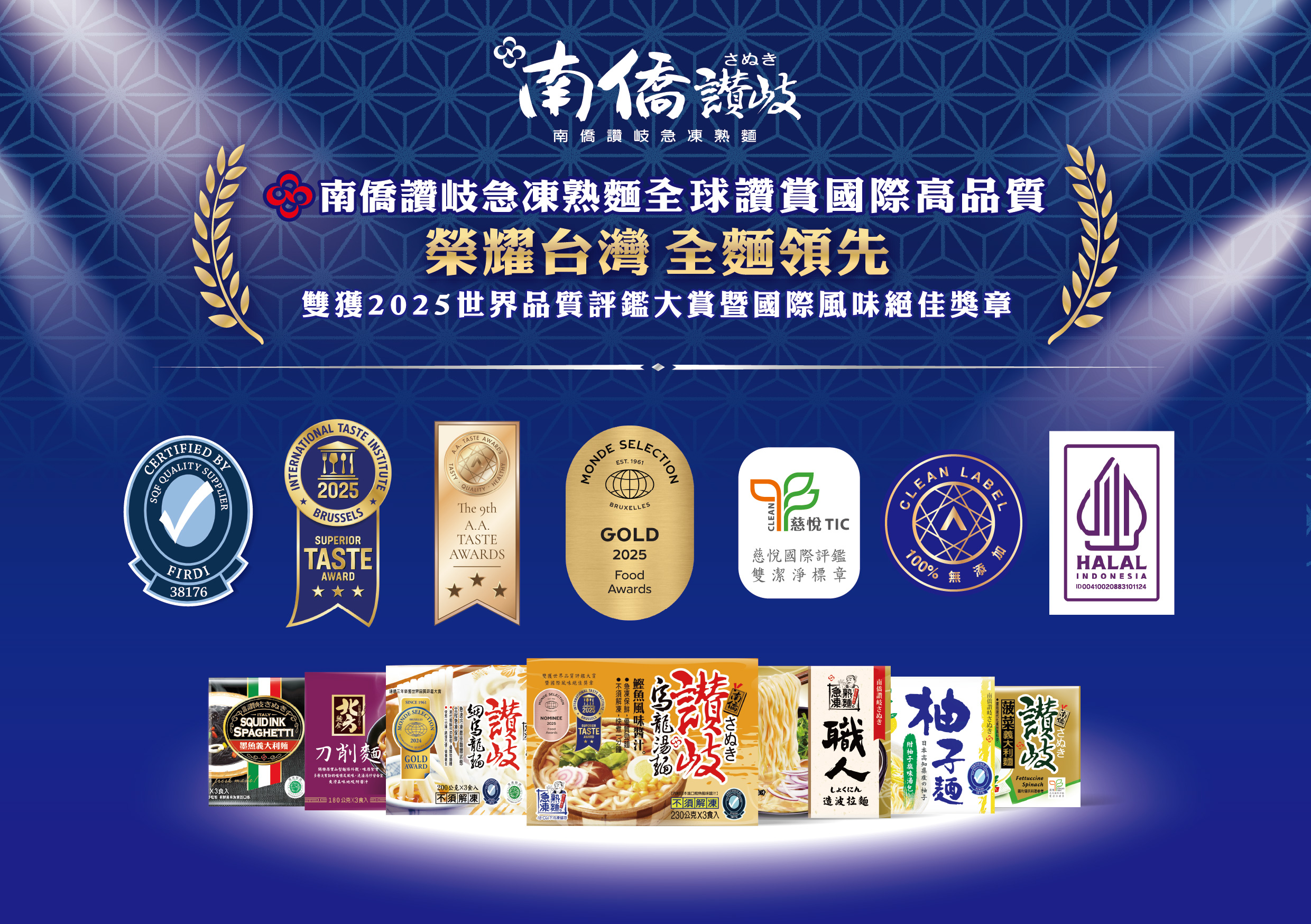 Namchow Sanuki Frozen Pre-Cooked Noodles integrates R&D, production, sales, and service into one seamless process. It employs professional, high-tech automated rapid-freezing noodle equipment featuring cutting-edge technology, and it has achieved multiple international high-standard food safety certifications as well as the highest honors in global culinary awards. These include SQF (Safe Quality Food) at the highest international food safety level and Halal certifications (MUI, BPJPH, THIDA). Taste recognitions include the Tse Yue Double Clean Label, A.A. 100% No-Additive Verification, the Monde Selection Gold Award for five consecutive years, and the iTQi Superior Taste Award (Three Stars) for five consecutive years.