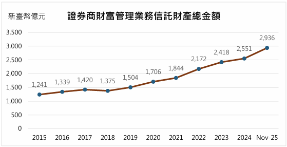 According to statistics published by the Securities Firms Association (as shown in the figure above), the scale of trust assets managed by securities firms increased from NT$124.1 billion at the end of 2015 to NT$293.6 billion by the end of November 2025, representing approximately a 2.36-fold growth over a ten-year period. However, as of the third quarter of 2025, the total size of trust property in Taiwan had reached NT$19.51 trillion. Of this amount, the combined total of pecuniary trust (excluding custody of securities investment trust and futures trust funds) and securities trust assets that securities firms are permitted to conduct amounted to approximately NT$9.35 trillion. Banks accounted for more than 90% of the market share in these two categories of trust business, while securities firms held only around 3%. As a result, securities firms continue to seek regulatory breakthroughs to expand opportunities in wealth management, with the aim of enhancing their competitiveness vis-à-vis the banking sector.