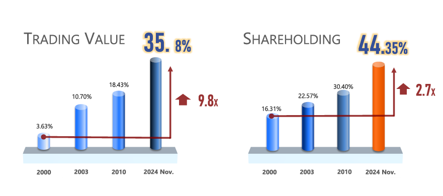 在上述逐筆交易及AI科技的環境下,加上臺灣上市公司的營收與獲利表現亮眼,吸引國際資金源源不絕流入。此外,臺灣股市具高殖利率與合理本益比優勢,2023年平均殖利率約3.37%,提供穩定的股息收益,且本益比相較全球市場具競爭力,進一步提高投資吸引力。外資在臺股的成交值比重自2000年的3.63%,成長至2024年11月的35.8%,相較2000年比重提升9.8倍。而外資持股市值比重亦自2000年的16.31%逐步攀升,截至2024年11月底已達44.35%,參與交易且長期持有,顯示外資對臺股市場未來發展具高度信心。