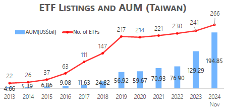 近年來,臺灣ETF市場展現爆發式成長,資產規模與商品數量均快速擴張。截至2024年11月底,臺股市場共有266檔ETF,總資產規模達1,948億美元,在亞洲排名第三。回顧過去10年,臺灣ETF資產規模成長近36倍,上市ETF數量增加近10倍,成為投資者重要的配置工具;即便在2022年全球股市因美國聯準會升息而回檔,全球ETF的資產規模下滑9.85%的背景下,臺灣ETF資產規模當年卻逆勢成長11%,突顯投資人對ETF的高度興趣,且對臺股深具信心。