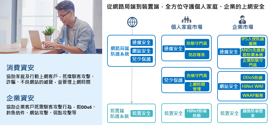 「上網資安服務」為每月收取月租費的持續性營收業務,在ISP網路局端為寬頻及行動上網用戶提供「防駭守門員」、「色情守門員」、「DDoS防護」等資安服務,有效阻絕惡意網站、詐騙與駭客攻擊於連網設備之外。
