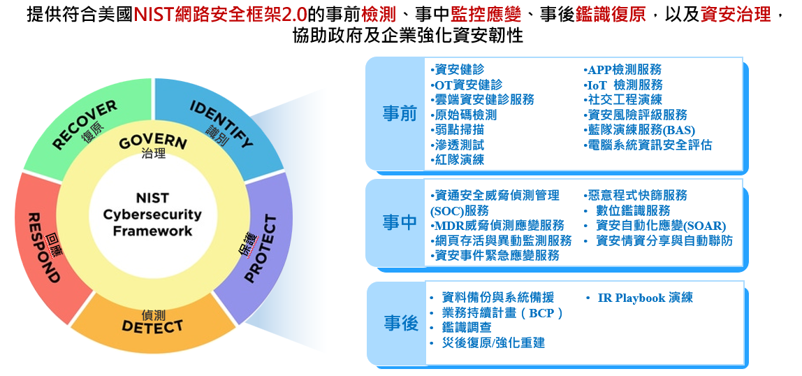 「資安專業服務」提供符合美國NIST網路安全框架(CSF 2.0)的一站式服務,涵蓋事前檢測、事中監控應變及事後鑑識復原,憑藉頂尖的技術團隊與豐富的實戰經驗,在政府、金融及高科技製造業等關鍵領域建立卓著聲譽。
