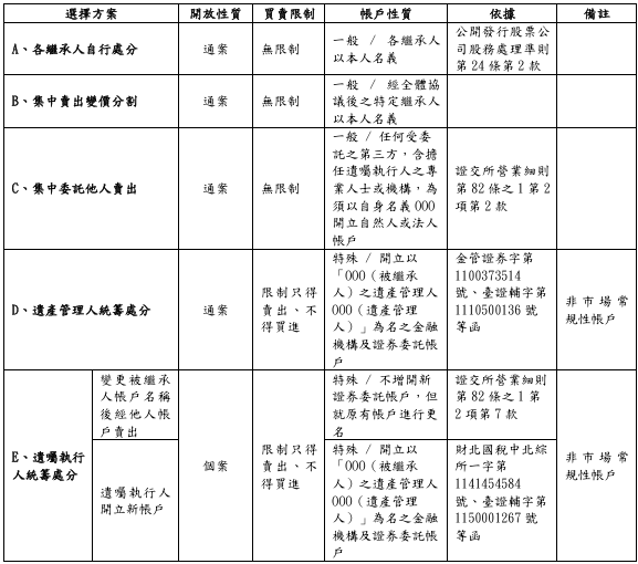 參過往昔案例,為協助證券業者與遺產繼承人等,順利解決借戶賣出被繼承人名下持股之部分技術障礙,如該案系爭有價證券股數偏低,相關出售價值殊屬有限,則經證券周邊單位共同判斷,認或不致引發爭議,則不排除可先行循「集保結算所」、特定證券業者、擔任遺囑執行人之律師群等,共同研議達成共識之方式,破例就部分依現行規定恐屬窒礙難行之特殊個案,申請以專案核准方式,透過該證券業者申請以變更戶名,而非以遺囑執行人為名開立新帳戶之變通方式辦理,並限制該證券業者之帳戶操作範圍,囑其就該變更名稱後之臨時性帳戶,不得逕以執行賣出作業,僅得另行借戶委託,始可處分被繼承人名下有價證券。