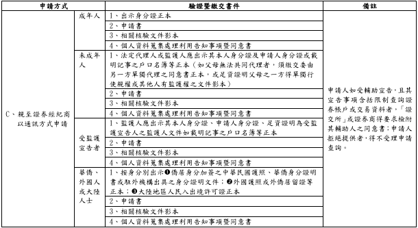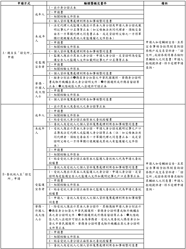 至於申請以上資料之方式,除親赴「證交所」臨櫃填表申請之外,亦可委託他人代辦申請手續。另為配合非設籍於臺北市之申請人,避免舟車勞頓之苦,還可以選擇就近於戶籍地或居住地所在之證券商,於該業者之正式營業據點(註:未明文禁止簡易分支機構不得受理),以通訊方式提出申請。此時,證券經紀商應指派登記合格之業務人員,查驗申請者之身分及申請書件,經確認無誤後出具證明書,併同申請書件等正式發函向「證交所」提出查詢。申請時應附貼足掛號郵資之回郵信封,「證交所」嗣將查詢結果逕寄申請人、法定代理人或監護人。