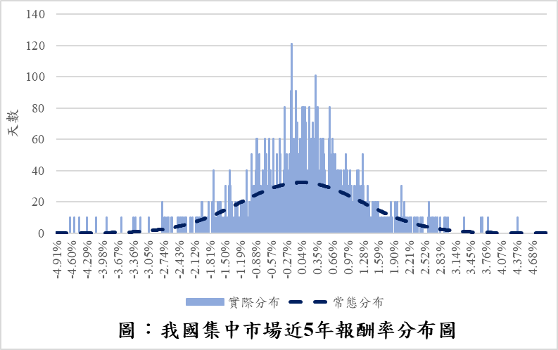 雖然理論上參數法存在上述限制,惟回到我國集中市場實務環境觀察,現行方法仍具相當合理性。綜合市場交易商品結構、市場波動與報酬率分布,以及現行模型運作之實務需求等三個面向觀察如下: