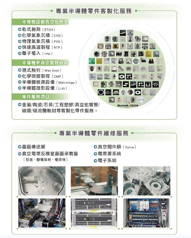 天虹科技長期致力於半導體製程設備機台與關鍵零組件的研發製造與專業服務,且通過全球半導體各大晶圓代工製造廠及記憶體晶圓製造廠的驗證,是一間與客戶具有長期合作關係的績優合格供應商,客戶橫跨矽基半導體、化合物半導體、光電半導體、半導體封裝等領域。在厚實的技術與經驗基礎上,整合專業團隊投入大量資源於產品測試及半導體工程應用開發,半導體設備零配件中高達70%為台灣製造,落實MIT在地化生產的目標,更帶動台灣精密機械相關產業技術與營收的提升,是台灣卓越的先進半導體設備與零備件之先驅。
