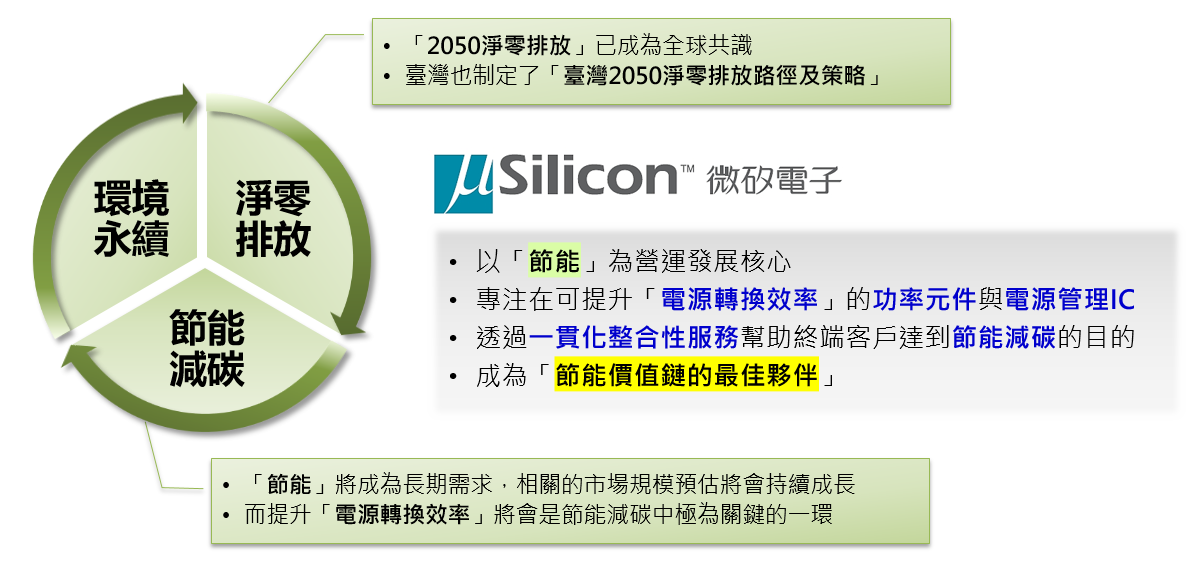 展望未來,環境永續、淨零排放及節能減碳已成全球共識,「節能」已成為長期需求,相關市場規模預估將會持續成長;而提升各電子產品之「電源轉換效率」,將會是節能減碳中極為關鍵之一環。微矽電子以「節能」為營運發展核心,專注在可提升電源轉換效率之功率元件與電源管理IC,透過完整一站式整合服務,幫助終端電子產品製造商和消費者達到節能減碳的目的,使微矽電子成為「節能價值鏈的最佳夥伴」。